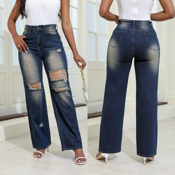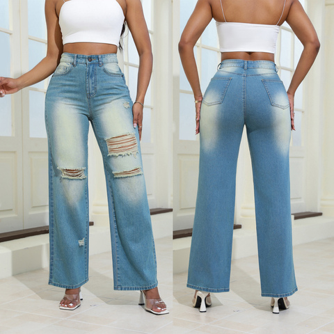 2025 nuevos pantalones de pierna recta rasgados medios europeos para mujeres americanas transpirables Botón de algodón lavado SKINNY adulto de moda