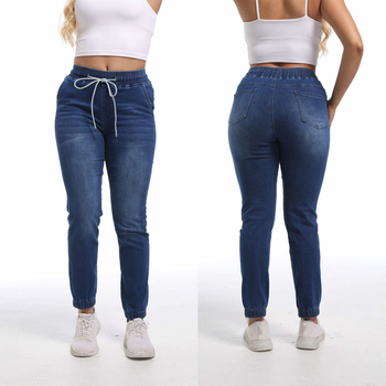 2025 automne hiver usine en gros taille haute bleu clair Denim coupe ajustée rue lavé Harlem cordon jambe crayon pantalon